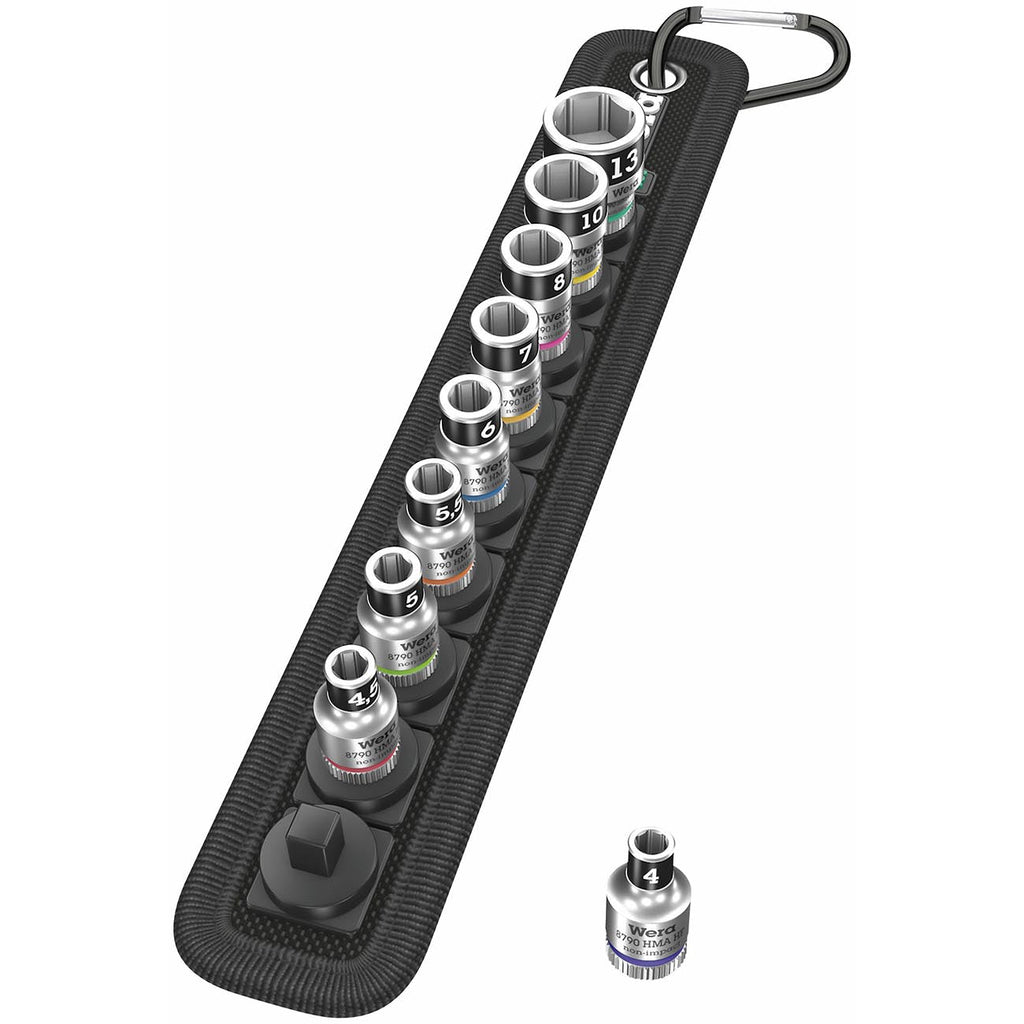 Wera 1/4" Drive Metric Sockets — On Storage Belt (10 Piece) bring professional-grade organization and portability to your toolbox. This compact set covers essential metric sizes in a convenient, belt-ready package for automotive, bike, electronics, and DIY projects.