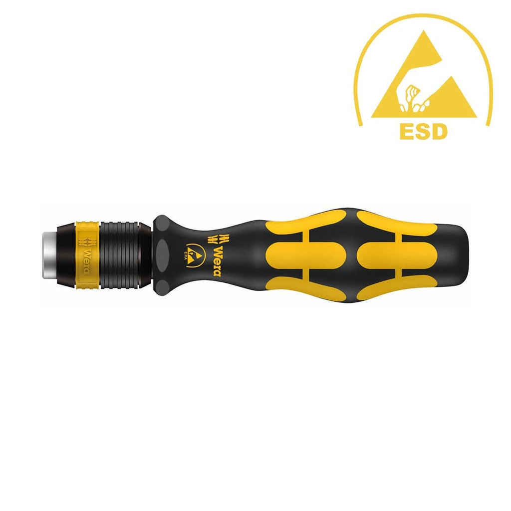 Meet the Wera ESD-Safe Bitholding Screwdriver Handle with Quick Release Bit Holder—crafted for electronics-focused work where precision, safety, and efficiency matter. This tool combines an ESD-safe design with a secure bitholding system and a fast, effortless bit change mechanism, empowering you to work confidently on delicate components and assemblies.