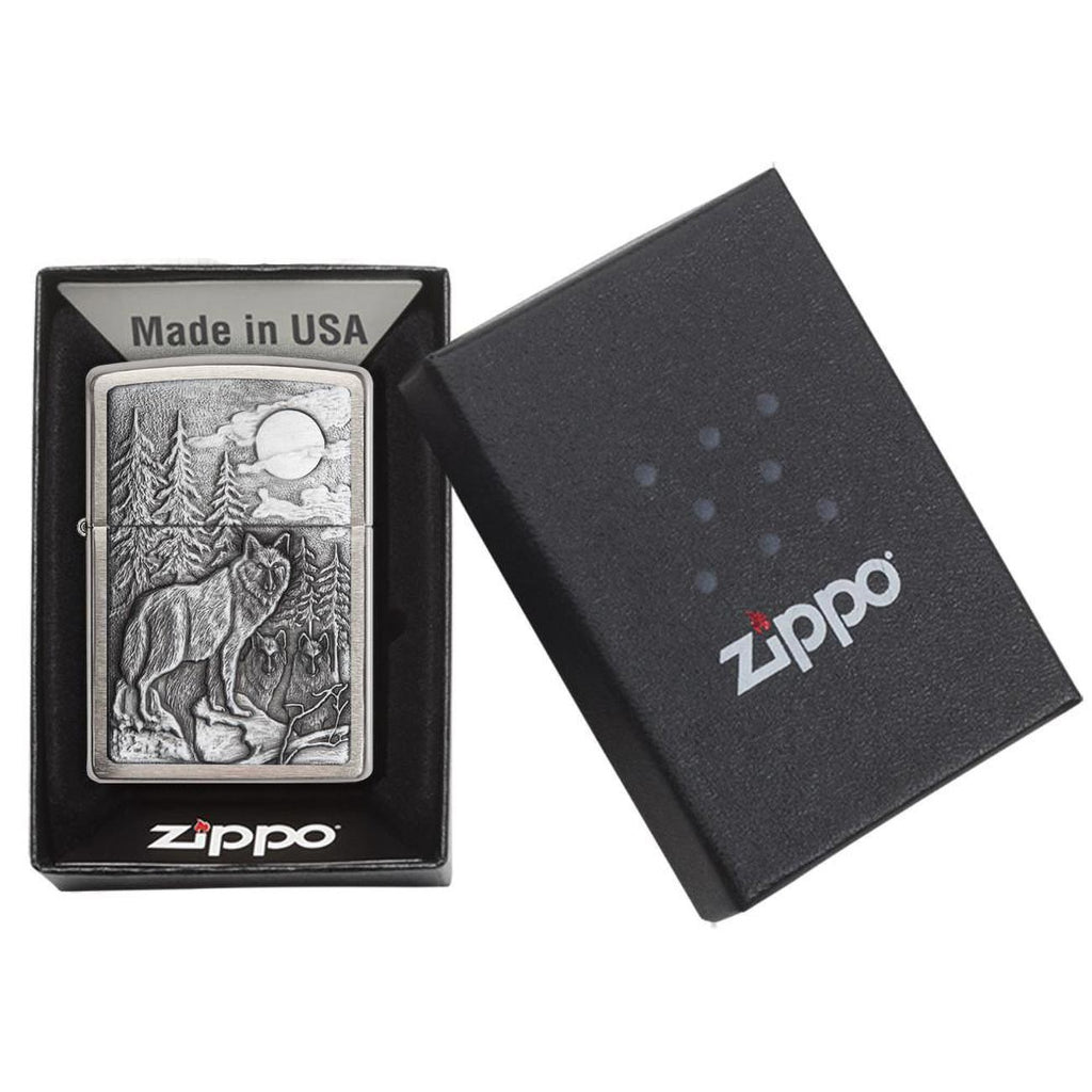 Zippo Windproof Lighter with the Timberwolves Emblem in Brushed Chrome. This windproof lighter features an emblem displaying a wolf in the wilderness and a rugged brushed chrome finish for standout style. Its all-metal construction is about 1.5 times thicker than a standard Zippo case, delivering increased durability and a premium feel. It ships in a gift box, making it an ideal gift for collectors or fans alike.